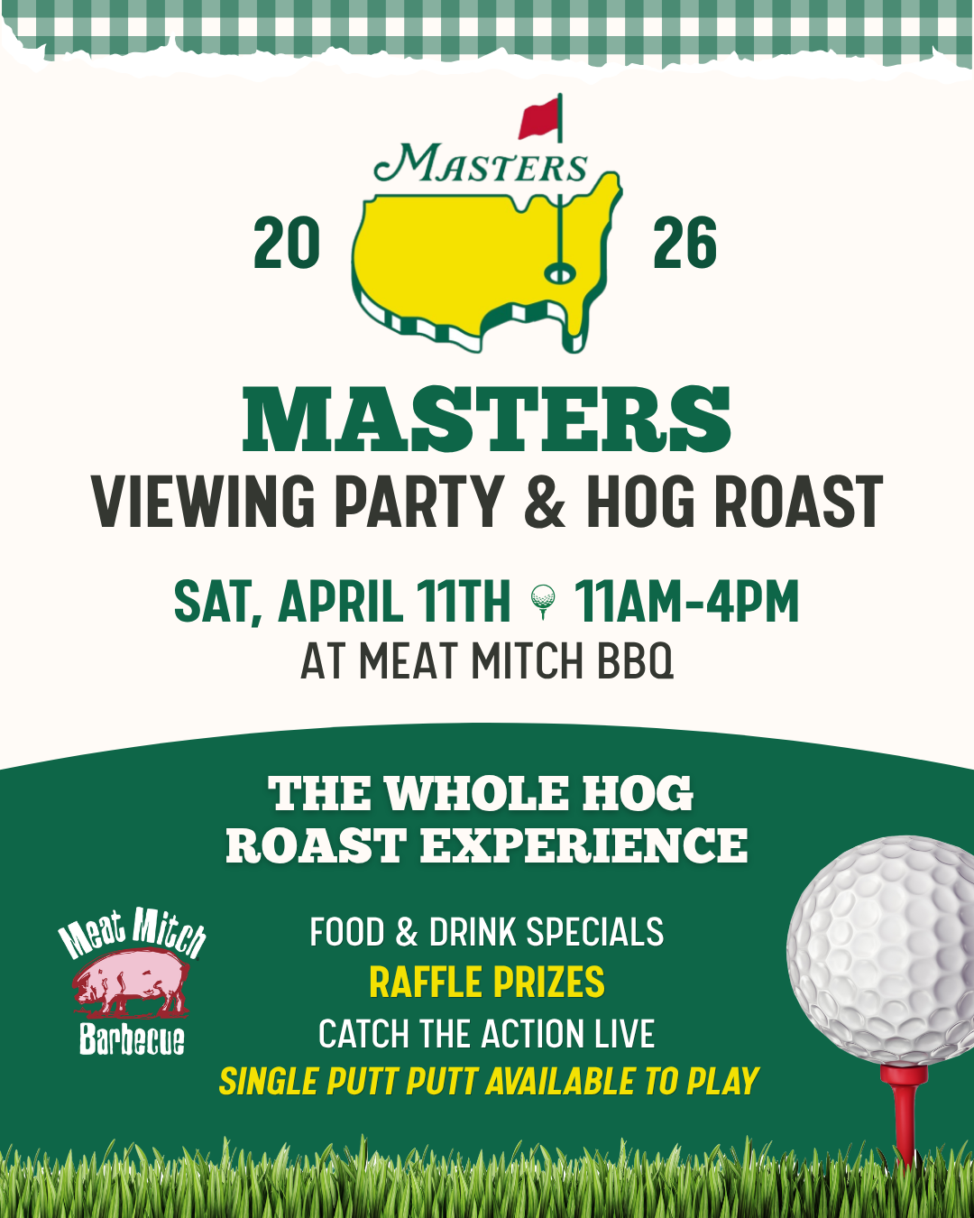 Celebrate Masters Week at Meat Mitch BBQ with tournament watch parties, classic themed food and drink specials, and a can’t-miss whole hog roast on Saturday, April 11 from 11am-4pm.